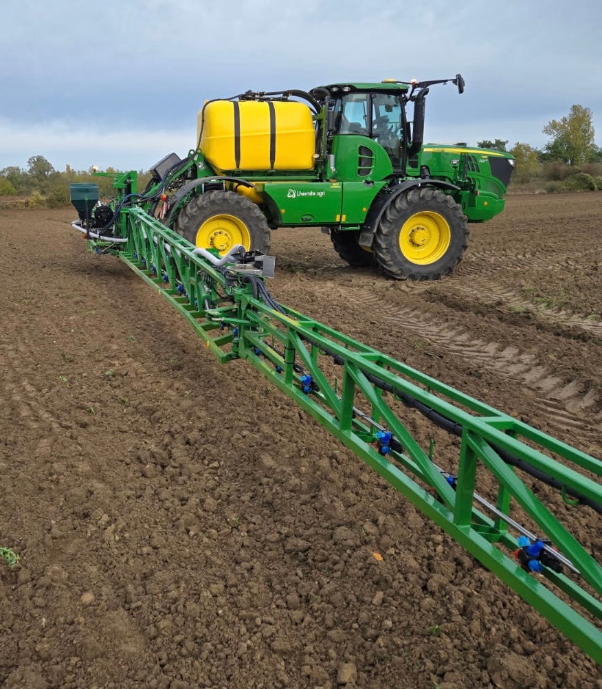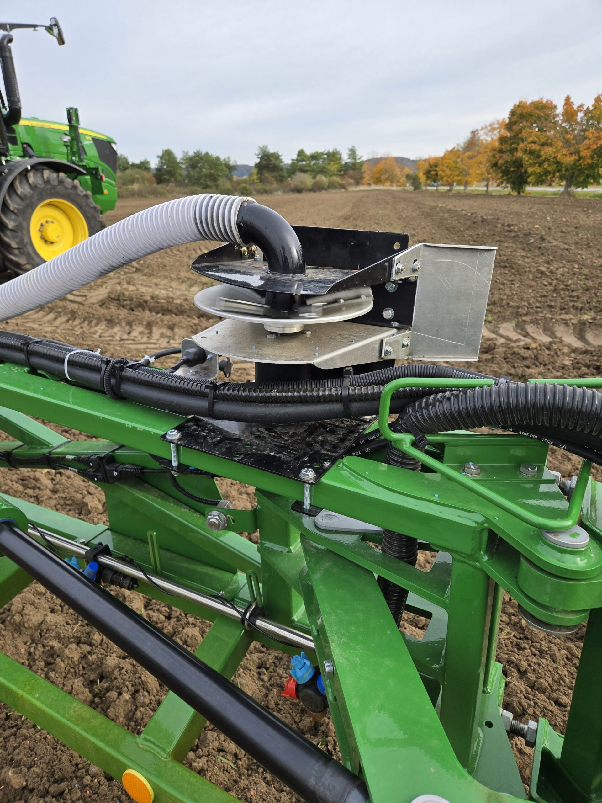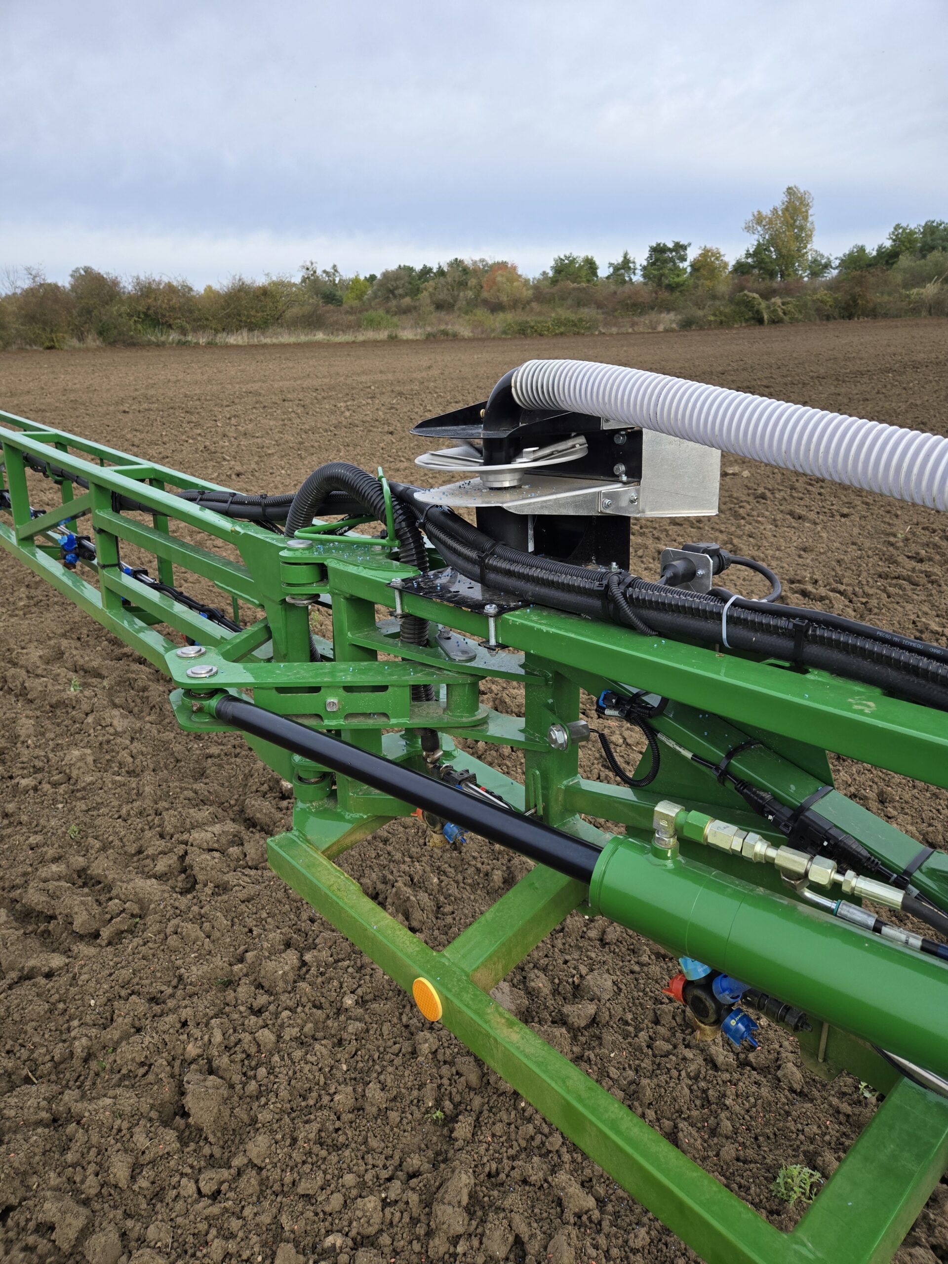 • Se coloca en el centro de un brazo pulverizador. El dispositivo se suministra con dos salidas, cada una con dos mangueras de 40 mm de diámetro, una turbina y un motor eléctrico situados en el centro de cada mitad de la barra.